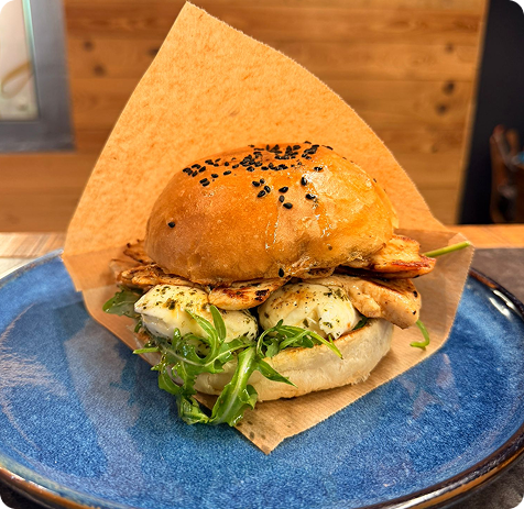 Pain maison, Buffala, filet de poulet grillé, roquette, huile d’olive, basilic.